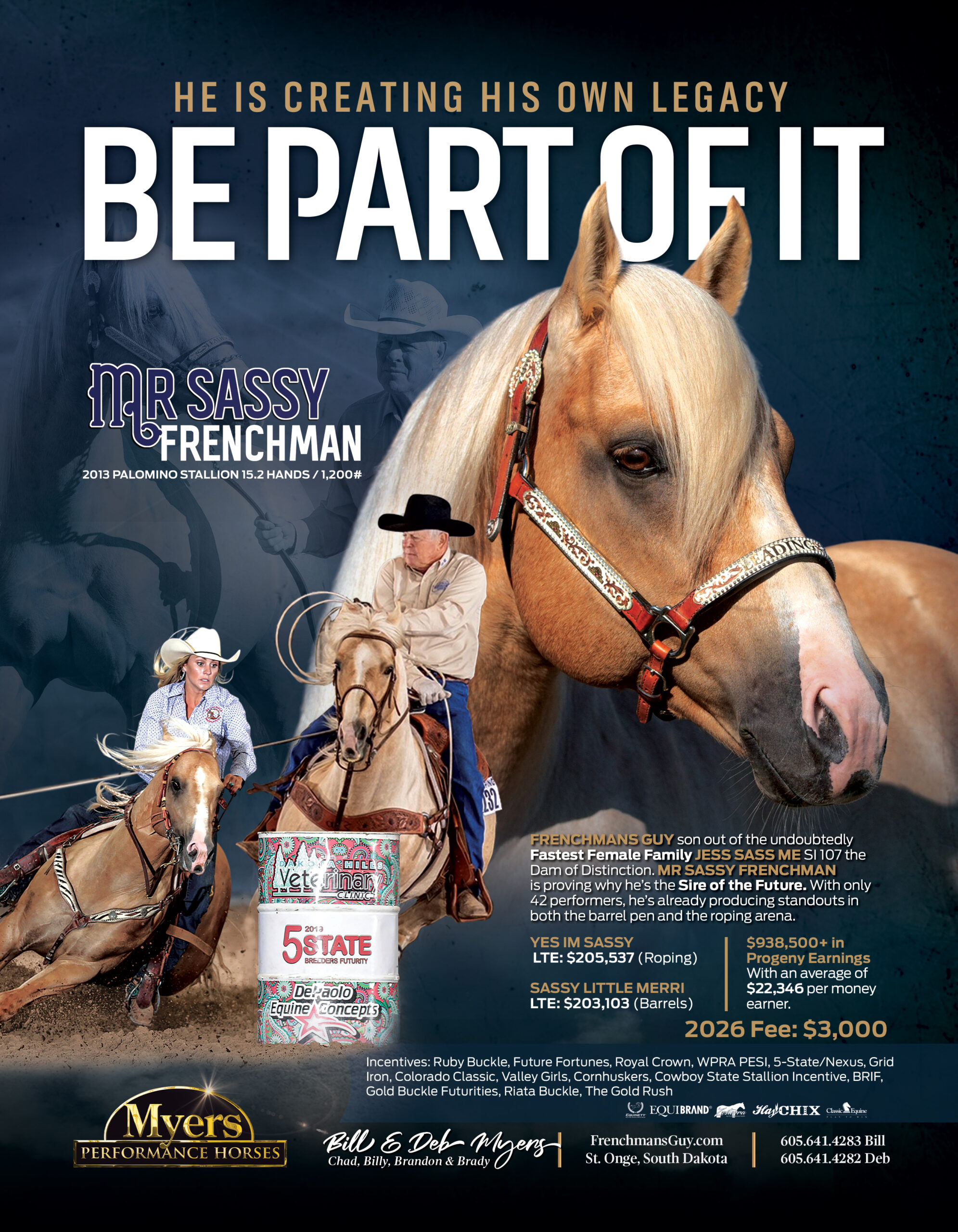 | FRENCHMANS GUY A Leading Barrel Futurity Sire; Progeny Earnings in Excess of $10+ Million | Sun Frost All-Around Performance Sire; Sire Of Championship Rodeo Athletes; 4x World Champion Barrel Horse And AQHA, PRCA Horse Of The Year; Dakota Classic Cutting Futurity Champion; Progeny Earners Over $2.2 Million | Docs Jack Frost A NCHA Certificate Of Ability; 1972 NCHA Derby Finalist; Sire Multiple Performance ROM; Superior Performance Sire; Two AQHA World Champions, Cutting, Two Hi-point Cutting Sire NFR Barrel Racing Qualifier |